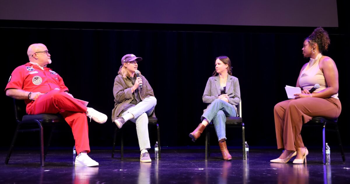 BUSD_LEMURAL1: San Dimas High School Class of 2005 alumnae Kat Bingley (middle left) and Barbara Bingley-Verseman (middle right) discuss the film “Le Mural” at a screening at the Bonita Center for the Arts on Sept. 26. The screening was hosted by San Dimas art teacher Dominic Black (far left) and moderated by San Dimas Class of 2020 alumna Eve McFarland (far right).