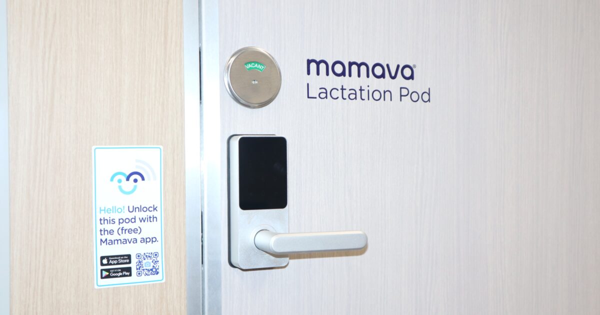 Each pod comes with built-in seating, a fan and white noise system, lighting, shelves, a mirror, coat and bag hooks, and charging outlets. Parents access the pods with the Mamava app so there is no need to track down a key and they can easily check if the space is occupied.