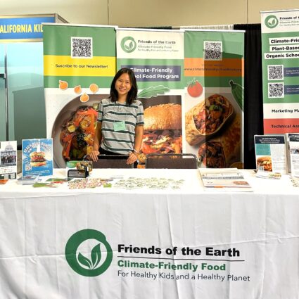 Sayre was present at the annual California School Nutrition Association Conference, held last October in Pasadena, when Lin spoke to an audience of nutrition service directors and school foodservice industry members about her work interning with environmental agencies and hospitals, and the health benefits of plant-based meals. Lin then got a chance to tour the conference exhibit hall, with more than 1,200 vendors, and talk to organizations that provide vegetarian and vegan food for school meals.