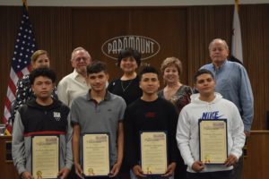 Four students from Paramount High School were honored for heroic actions by Mayor Diane Martinez during a June 19 Paramount City Council meeting. Fernando Melgar, Gabriel Orozco, Juan Garza and Anthony Farias were commended with certificates of recognition from the mayor for assisting injured students during a car accident in March. The injured students were treated and released from a local hospital.
