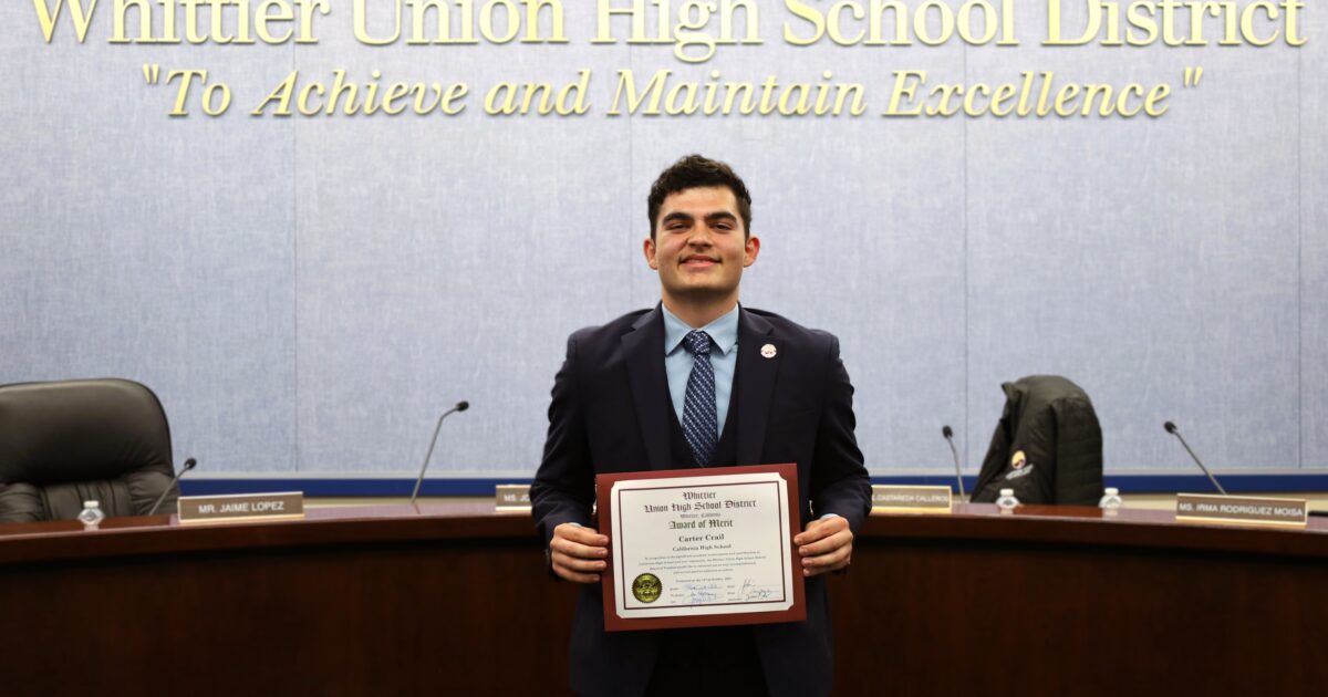 WUHSD_AWARDOFMERIT1: California High School senior Carter Crail was honored with an Award of Merit, presented by the Whittier Union Board of Trustees on Oct. 14, celebrating his academic determination and excellence, as well as his kindness and leadership.